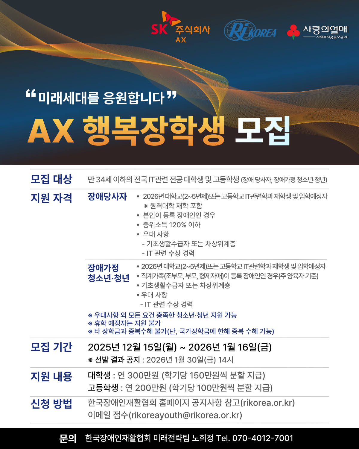 2026년 SK(주) AX 행복장학생 모집 안내 - 만34세 이하 IT관련 전공 장애당사자 및 장애가정 해당